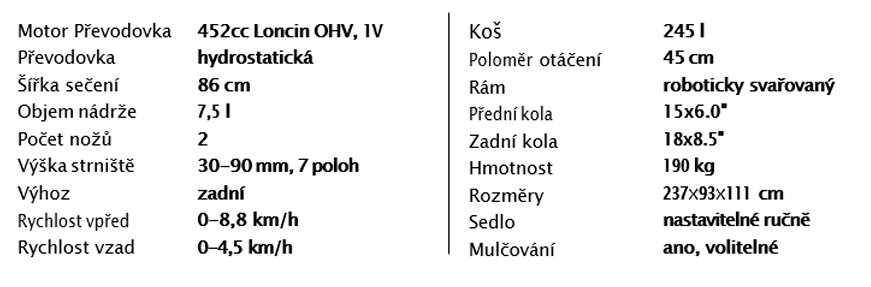 Vhodný pro plochu až 3500 m2 . 452cc motor Loncin pro pořádný výkon. Hydrostatická převodovka pro jízdu bez řazení. Dva nože pro čistý sběr a rovnoměrný střih. Záběr 86 cm a malý poloměr otáčení pro snadnou průjezdnost. Koš 245 litrů pro méně vysypávání.